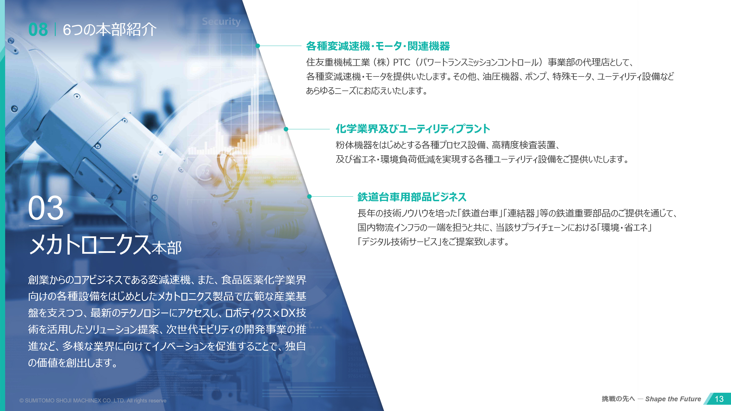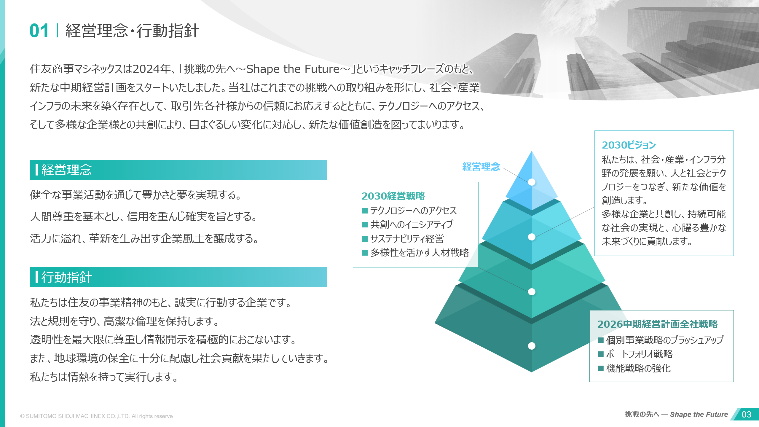経営理念・ビジョンの刷新に伴い、ブランドの価値観をより的確に伝えるためにデザインを一新。挑戦と共創を掲げる姿勢を、先進性と信頼感を両立したビジュアルで表現しました。またSDGsへの本格的な取り組みやマテリアリティの特定といった経営方針の転換を受け、サステナビリティをデザインに落とし込むことを重視して、環境・社会を意識した配色や構成にいたしました。
